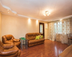 Первая комната совмещена с кухней: двуспальный кожаный диван, столик, два кожаных кресла, комод с телевизором. Кухная: барная стойка, стулья, вся необходимая посуда, чайник, микроволновка, стиральная машина, плита, холодильник, вытяжка. Вторая комната: большая двуспальная кровать, две прикроватные тумбочки, шкаф с зеркалом, телевизор, стойка под TV. Санузел: кафель, качественная импортная сантехника, ванная, раковина с зеркалом, туалет. Прихожая: комод, зеркало, вешалки для одежды.